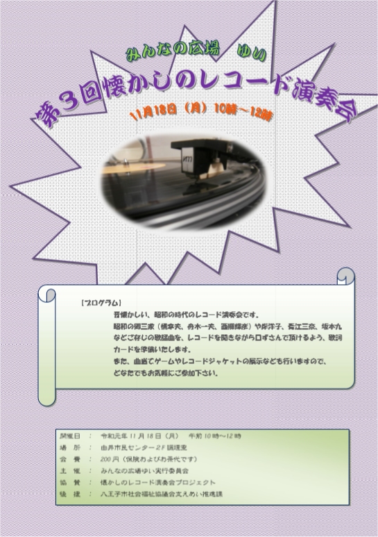 みんなの広場ゆい 第3回懐かしのレコード演奏会のご案内