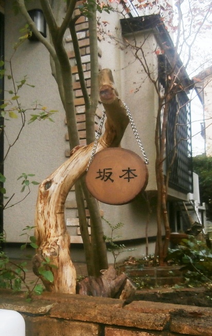 その時に津久井湖に流れ着いた流木を、何かに利用できないかと1本持ち帰ってきました。丁度曲がり具合も吊り下げるのに具合が良さそうなので、表札をぶら下げることとしました。